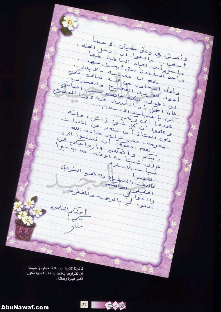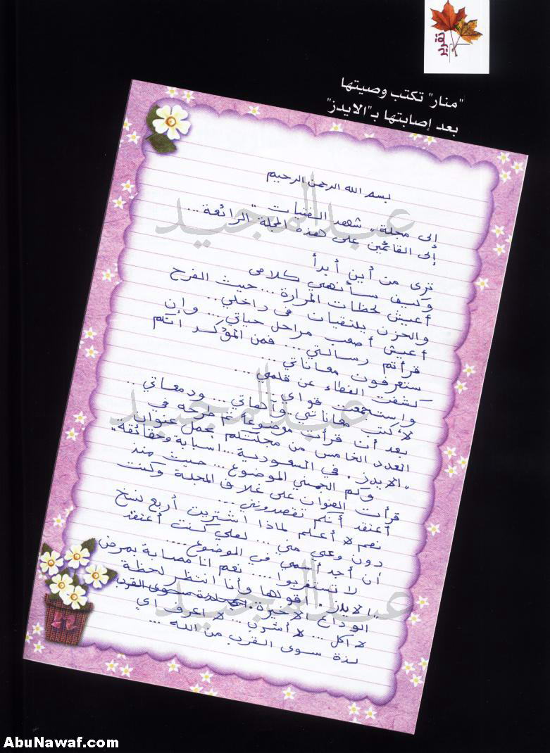 ![]() ســلام عليكم شحالكم يالاعضاء؟ هالموضوع شفته وحبيت احطه لكم.. ![]() ![]() بسم الله الرحمن الرحيم إلى مجلة شهد الفتيات إلى القائمين على هذه المجلة الرائعة ترى من أين أبدأ وكيف سأنهي كلامي أعيش لحظات المرارة ..... حيث الفرح والحزن يلتقيان في داخلي أعيش أصعب مراحل حياتي , وإن قرأتم رسالتي فمن المؤكد أنكم ستعرفون معاناتي ,كشفت الغطاء عن قلمي واستجمعت قواي لأكتب معاناتي وآهاتي , ودمعاتي بعد أن قرأت موضوعاً تم طرحه في العدد الخامس من مجلتكم يحمل عنوان " الإيدز في السعودية ... أسبابه وحقائقه " وكم ألجمني الموضوع , حيث منذ قرأت العنوان على غلاف المجلة , وكنت أعتقد أنكم تقصدونني نعم لا أعلم لماذا اشتريت أربع نسخ دون وعي مني ..... لعلي كنت أعتقد أن أجد اسمي في الموضوع..لا تستغربوا .... نعم أنا مصابة بمرض الإيدز , أقولها وأنا أنتظر لحظة الوداع الأخيرة . لا آكل ..... لا أشرب ....لا أعرف أي لذة سوى القرب من الله...لا أعيش في وعي حقيقي إلا حينما أصلي .... وأدعو أن أدخل الجنة , ولعلي أجد الحياة الباقية فيها وأجد السعادة التي أبحث عنها نعم أنا مصابة بالإيدز ولعله امتحان من الله تعالى لكي أعود للطريق الصحيح والصواب.. لن أقول لكم ما هو سبب إصابتي , فأنا أخجل أن أتحدث في هذا الموضوع لكن يا فتيات الإسلام ... عودوا على ربكم واعلموا أن كل شيء زائل , وأنه على الفتاة أن تبتعد عن الملذات المحرمة , وعن ترك طاعة الله .نعم أدعوكم أن تلتفتوا إلى دينكم وأهلكم وأزواجكم , فمن ترك شيئاً لله عوضه الله به خيراً . فتيات الإسلامانتبهوافالدين والتمسك به هو الطريق الحقيقي لنجاتكموادعوا ليادعوا لي بالرحمة والمغفرة أختكم الناصحة لكم منار انتهت رسالة منار , ولا نملك إلا نرفع أيدينا بالدعاء لها بالثبات , وأن يغفر لها الله ويرحمها إنه أرحم الراحمين وصلى الله وسلم وبارك على نبينا محمد وعلى آله وصحبه أجمعين السلام عليكم ورحمة الله وبركاته ![]()